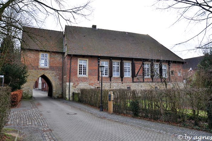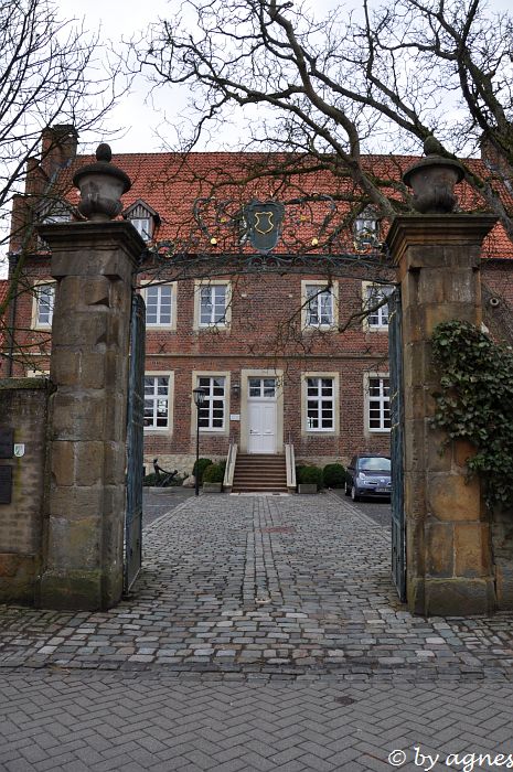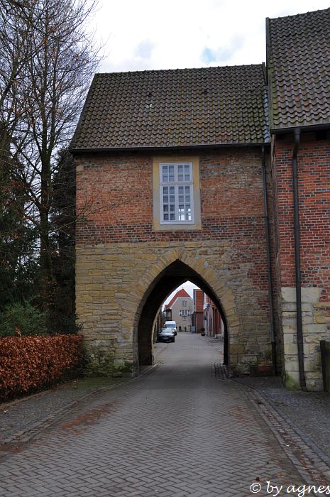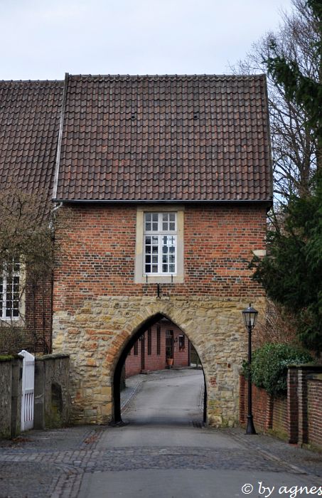 Das letzte, noch erhaltenen Stadttor, bildet mit dem Sendenhof eine bauliche Einheit. Das Schlosstor ist in der Art eines Torturmes ausgebildet. An dieser Stelle wird gut sichtbar, wie eng die Burgmannen an die Verteidigung der Stadt gebunden waren. An der Nordseite sieht man noch deutlich den Zusammenhang zwischen Tor und Burgmannshof. Zu den Straßenseiten hin finden wir kräftige Steinmauern. Mit ihnen schloß sich der adlige Burgmann von seinen bürgerlichen Nachbarn ab. |