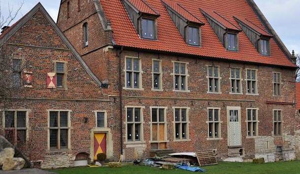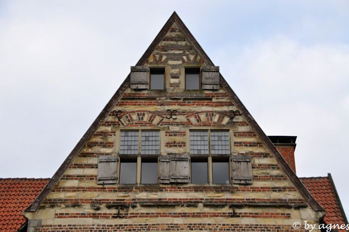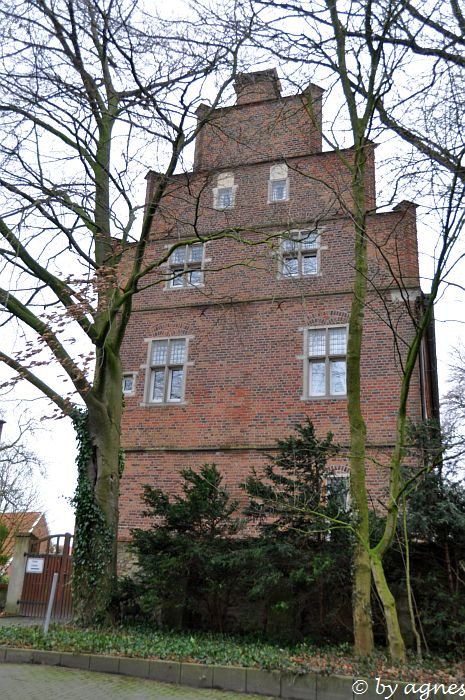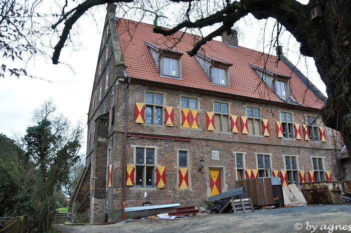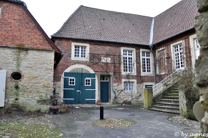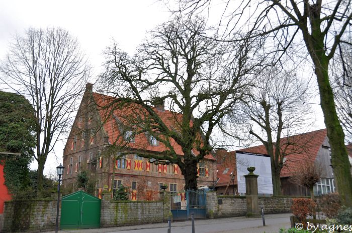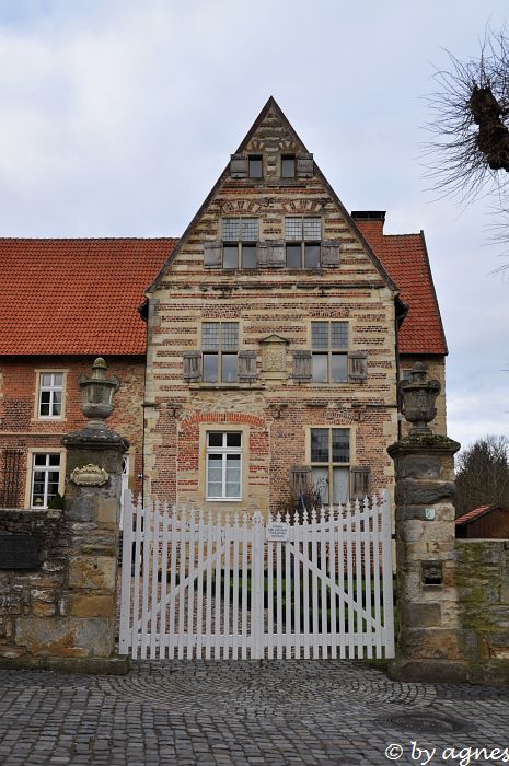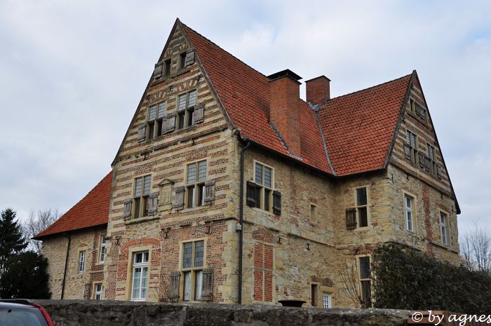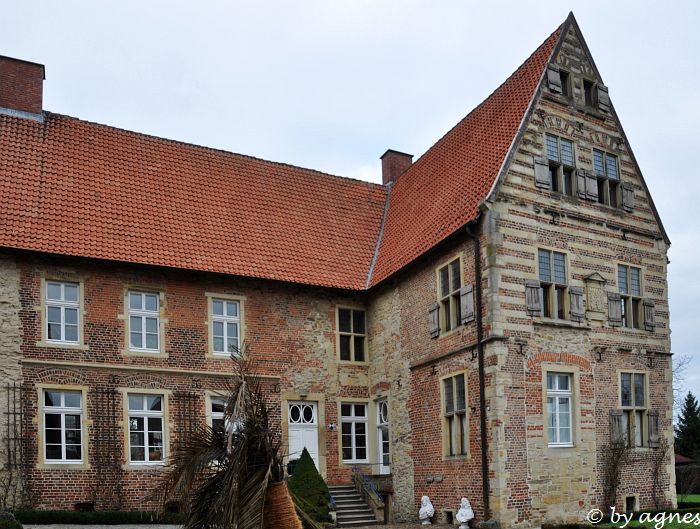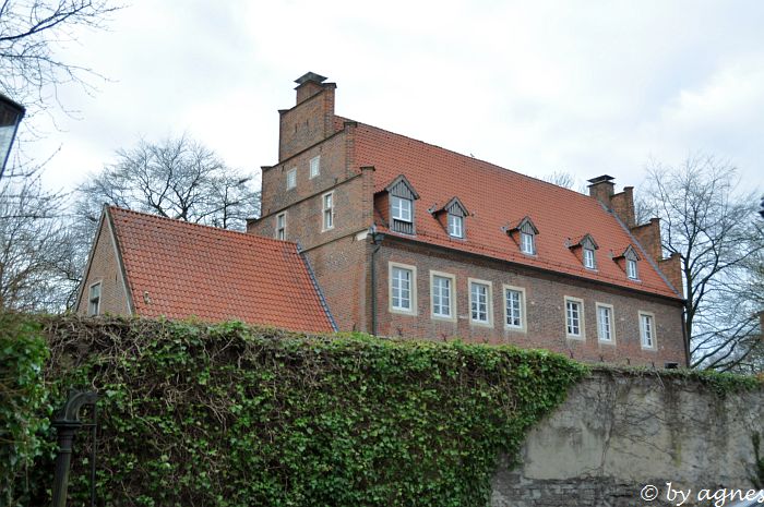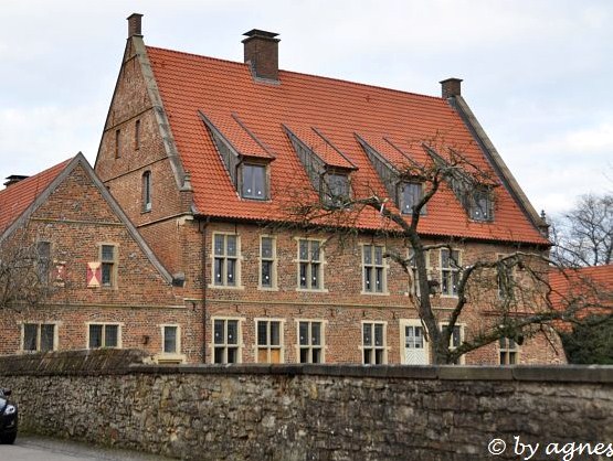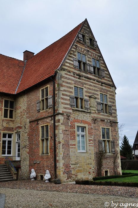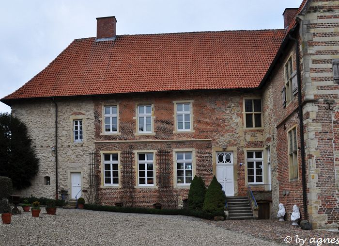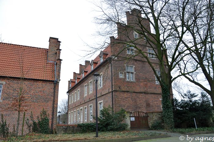 Erbaut von der Herren von Merveldt. Mit der Rückwand steht er auf dem Festungswall über der Gräfte. Heute ist das Bauwerk eine Zweiflügelanlage. Der Mervelder Hof ist einer der frühesten Anlagen dieses Typs im Münsterland. Seitenflügel und Ostgiebel weisen eine Besonderheit auf. Im Mauerwerk erscheinen abwechselnd Lagen von roten Ziegelsteinen und weißen Sandsteinen, ähnlich wie bei einer durchwachsenen Speckseite. Diese Specklagen treten hier erstmals nachweisbar in Westfalen auf und finden sich 60 Jahre später nochmals auf Haus Alst wieder. |