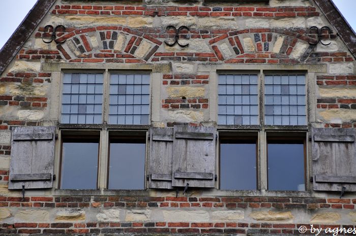 Den Schutz des Osttores mußte der Münsterhof übernehmen. Seinen Namen erhielt er von den adligen Herren von Münster, die bereits 1347 hier nachgewiesen sind. Wie alle anderen Höfe ruht er mit einer Wand an der Stadtmauer, deren Reste man noch im Garten sehen kann. Die zweistöckige Fassade wird hauptsächlich durch die zehn großen Steinkreuzfenster belebt. Die Eingangstür ist noch altertümlich zur Seite versetzt. |