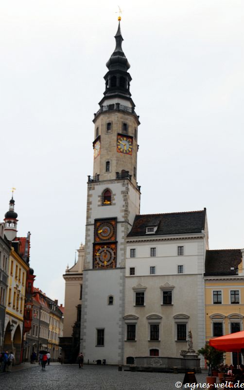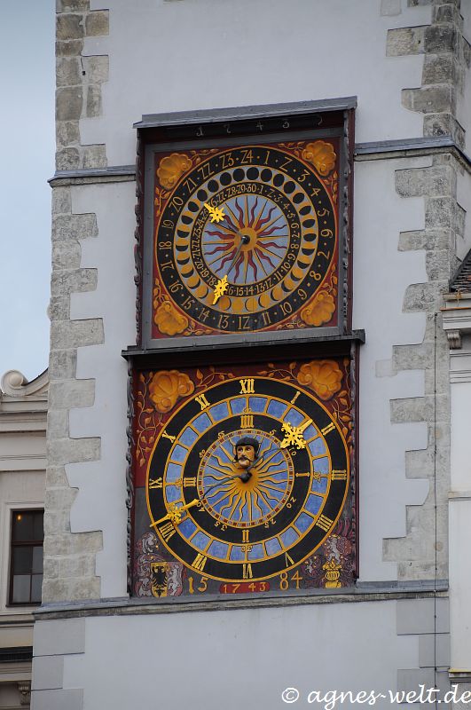 daneben das alte Rathaus mit seinem 60 Meter hohen Uhrenturm, mit zwei Uhren, von denen die untere eine Stundenuhr darstellt, darüber befindet sich eine Mondphasenuhr.