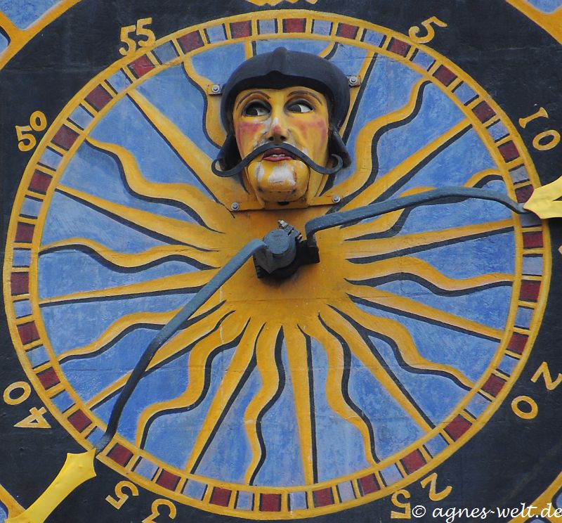 In der Stundenuhr befindet sich ein Wächterkopf. Er öffnet jede Minute die Augen und den Mund.