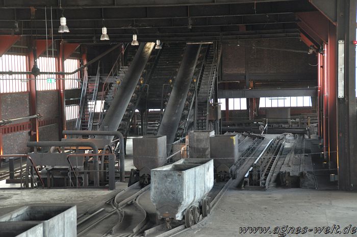 Die Schachtanlagen XII, 1, 1 und 8 der Zeche Zollverein sowie die Kokerei sind seit 2001 Weltkulturerbe. Zollverein wird auch als die "schönste Zeche der Welt" bezeichnet. Bereits 1986 wurde Schacht XII geschlossen, und mit der Stilllegung unter Denkmalschutz gestellt. Die Kokerei schloß 1993 nach nur 32 Jahren Betriebsdauer. Bei einer Führung durch die Wipperhalle, Wagenumlauf, Sieberei und Kohlenwäsche, entlang riesiger stillstehender Maschinen, unter dem Motto "Den Arbeitsalltag der Bergleute erleben" erlebten wir Zeche hautnah. Selbst die Geräuschkulisse wurde in einer Halle zu Demozwecken wiedergegeben. Wir erhielten aufgrund dieser Informationen sowie durch die versierte Führerin einen sehr interessanten und beeindruckenden Einblick, in die Welt des Bergwerkbaus, und erfuhren, wie schwer die Bergleute hier bis 1986 gearbeitet haben. |