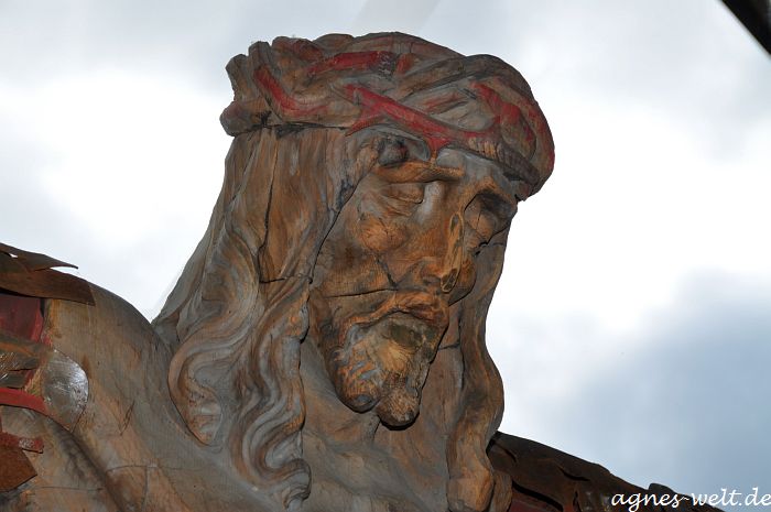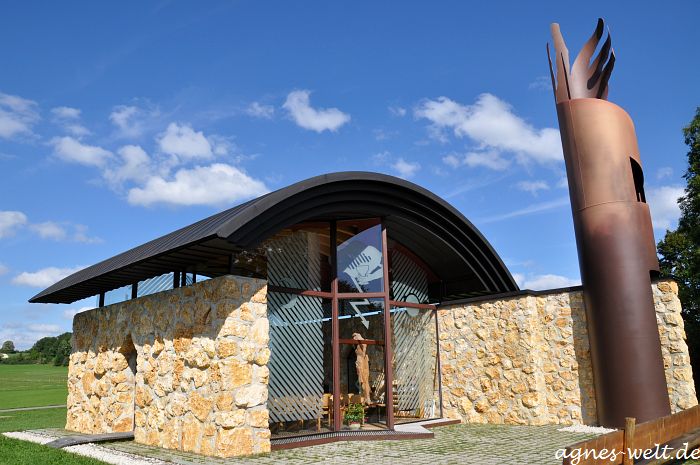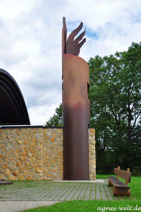 "Eine Kapelle wie die Arche Noah, über der sich der Regenbogen spannt", so der Gedanke des Ortspfarrers Pater Notker Hiegl, durch dessen Initiative der Bau dieser Kapelle verwirklicht wurde. Die Kapelle ist sehr transparent und modern gestaltet. Die Bilder und Ornamente auf den Scheiben sind sehr ansprechend. Das prägendsten Elemente ist der gekreuzigte Jesus auf dessen Arme sich die Flora und Fauna abzeichnen. Anstelle eines Kirchturms ragt eine Hand gen Himmel, sie soll die Hand Gottes zeigen. Mir hat diese Kapelle in ihrer Schlichtheit sehr gefallen. |