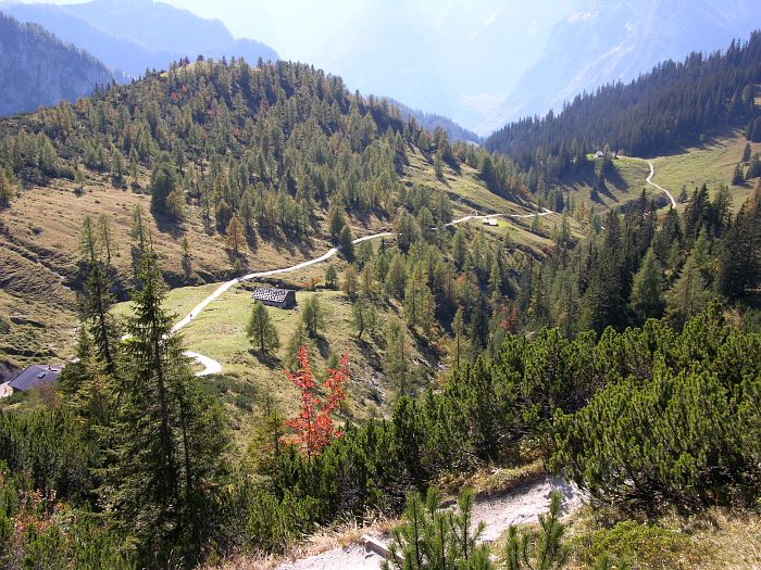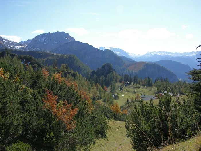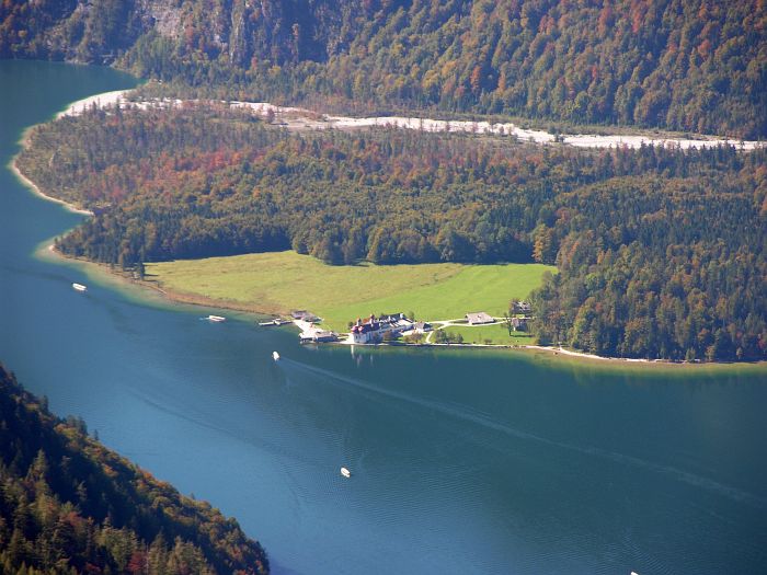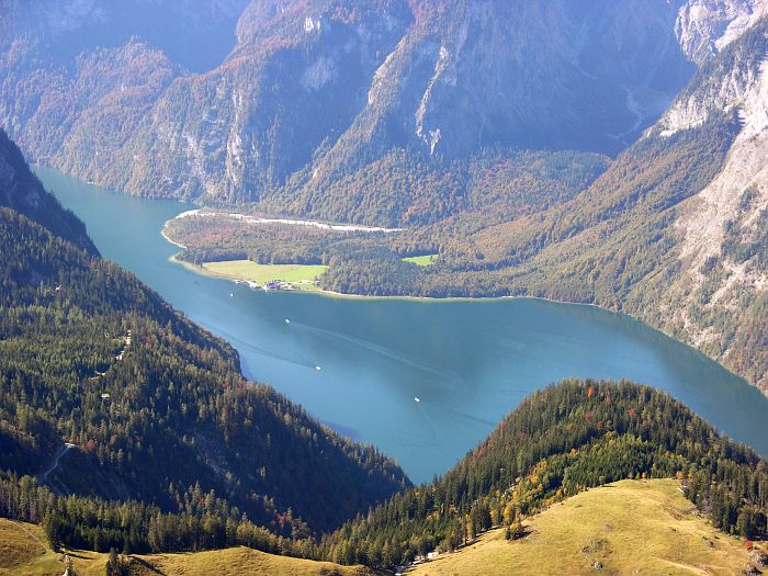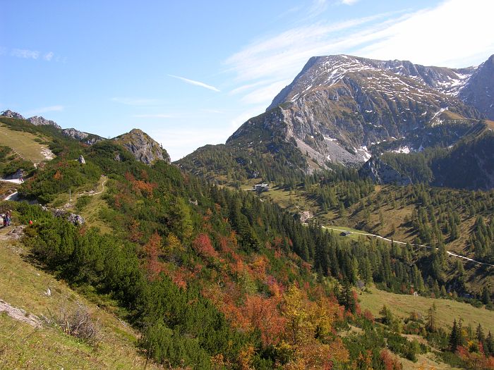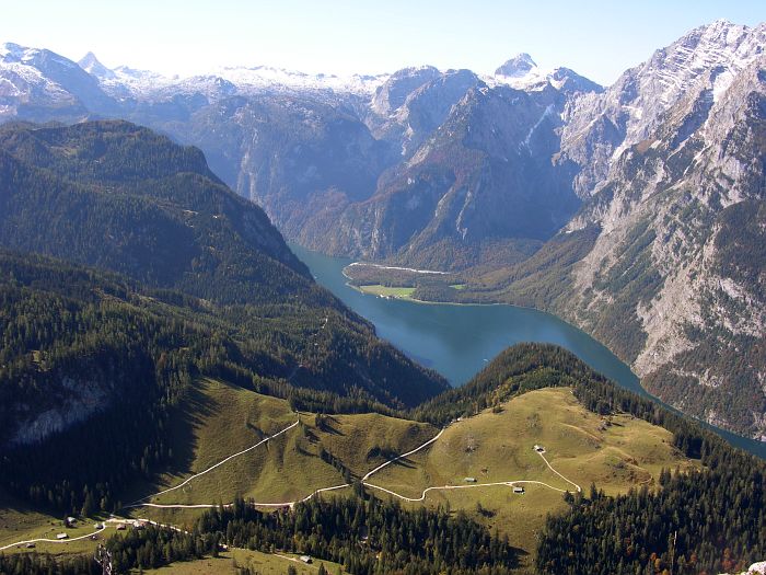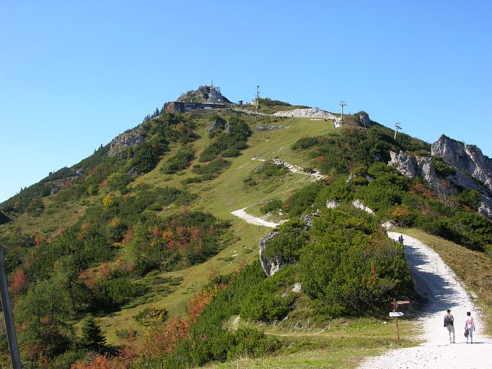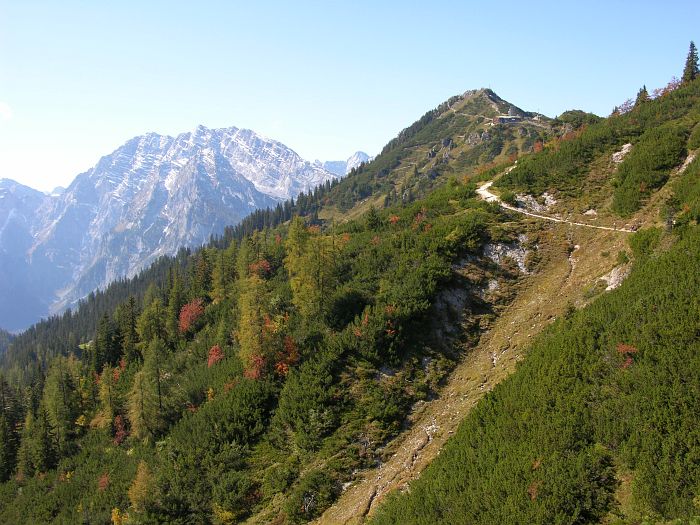 Der Jenner, mit seinen 1874 Meterm gehört nicht zu den höchsten Gipfeln des Berchtesgadener Landes. Er ist allerdings einer der wenigen Berge in der Region, dessen Spitze mit einer Seilbahn erreicht werden kann, die somit dem Jenner regen Besuch bescherrt. Die 1952 bis 1953 erbaute Jennerbahn, eine Kabinenbahn, transportiert die Wanderer und Ausflügler in 20 Minuten bequem bis zur 1800 m hoch gelegenen Bergstation, die knapp unter dem Gipfel liegt. Von der Bergstation führt ein gut angelegter, ungefährlicher Spazierweg zum Jenner Gipfel. Von dort hat man einen guten Panoramablick auf den 1200 m tiefer gelegenen Königssee sowie auf das 2713 m hohe Watzmannmassiv, dem dritthöchsten Bergmassiv Deutschlands. Ein weiterer angenehmer Höhenweg, führt in etwa 40 Minuten zum Stahlhaus. Am Rande der Wanderwege blühen Edelweiß und Enzian. |