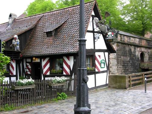 Immer wieder suchten wir Schutz vor Regen, entweder in einer Kirch oder in einem Gasthaus. Mittags hatten Thea und Fritz einen Tisch in einer Würstelbude reserviert, und das war auch gut so. Da die Tische draußen leer blieben, war es drinnen um so voller. Die Nürnberger Würstchen schmeckten uns vorzüglich, und dem Rolf, der eine "Extrawurst" bestellte nämlich Schäuferle, schmeckte es offensichtlich auch. Als Dessert gab es warmen Apfelstrudel und ein mir unbekannte Gericht mit Namen "Schlupfer", wobei wir dem Namen bzw. dem "u" gleich Strichelchen verpassten. ![]() das sind die besagten Nürnberger Schlüpfer ;-)) Mit Humor und Späßen versuchten wir die trüben Regengedanken zu verdrängen. Unvergesslich wird bleiben, dass Erwin die Pegnitz als Bach bezeichnete und Thea in gespielter Entrüstung ihm fast eine Szene machte.