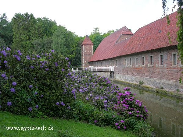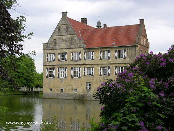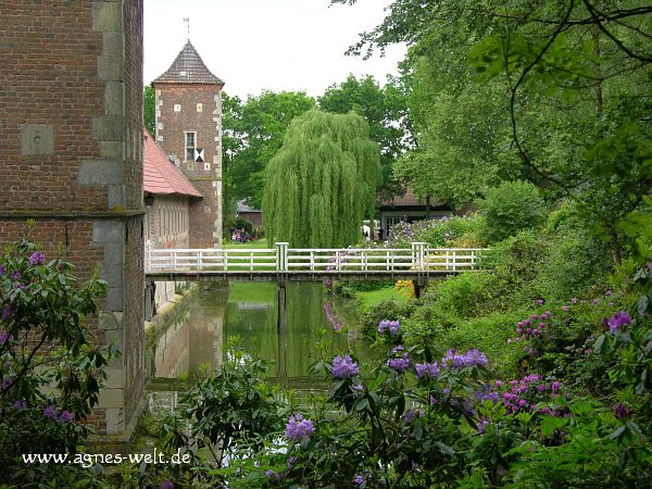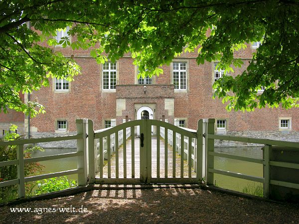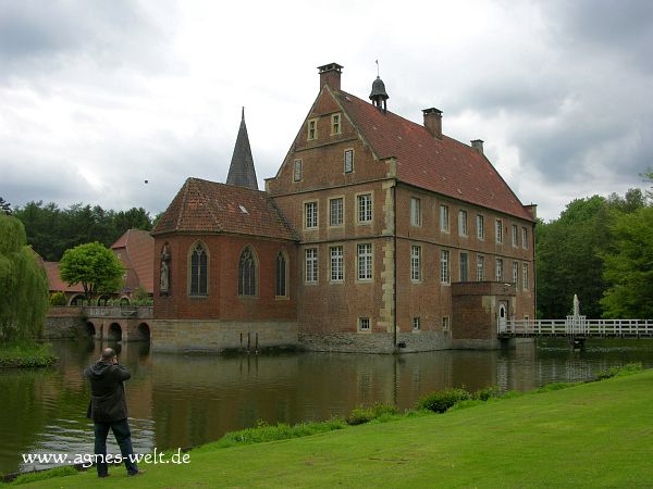 Heinz-Josef hatte im Vorfeld die Verantwortung für das Wetter übernommen, und außerdem wie sagt man so schön? "Wenn Engel reisen ...." und es waren ja 14 Engel und ein Engelchen unterwegs, um am diesjährigen Treffen teilzunehmen. So war es natürlich sonnenklar, dass wir beim Treffen keinen Regen hatten, wenngleich die Sonne sich ziemlich zurückhielt, da hätte Heinz-Josef ruhig noch etwas nachlegen können, aber wir waren sehr zufrieden, dass wir trockenen Fußes ---, aber darüber später mehr. Der Treffpunkt in diesem Jahr war Burg Hülshoff, eine typisch westfälische Wasserburg, die eingebettet in der malerischen Landschaft des Münsterlandes liegt. Fast zeitgleich trafen die Teilnehmer um 12.00 Uhr im Burgrestaurant ein, welches sich im Im alten Gewölbekeller des Herrenhauses befindet. Sylvia wurde von weiten von Erwin gesichtet, und er kündete sie an mit den Worten "da kommt jemand mit soooo einem Objektiv" wobei er in Angler-Manier zwischen 50 cm und einem Meter Abstand zeigte. Interessant waren die Erzählungen von Anette, Edith und Patrizia, die sich bereits einen Teil der Anfahrt hintereinander her fuhren, und in jedem Auto wurde gerätselt, "ob denn die andere(n) wohl auch zu dem Treffen fahren?". Der Gipfel war dann, dass Anette anhielt um einen Blick auf die Autokarte zu werden, Edith und Pat ebenfalls anhielten und Pat ausstieg und Anette fragte "Sag mal, fährst Du auch zu Agnes?" Die Anekdoten, Scherze und Begebenheiten im Einzelnen zu beschreiben ist gar nicht möglich, das muss man einfach live erlebt haben. Wenn z. B. jemand nach dem Weg zur Toilette fragt, und die Erklärung lautet, dass man zuerst die Eingangstreppe hochgehen muss, um einen Überblick über das Lokal zu bekommen, und das Schild zu sehen. Wenn das dann auch brav von allen gemacht wird, dann sind die Lachsalven garantiert. Erwins Bemerkung über das soooo große Objektiv von Sylvia, setzte eine äußerst effektive Diskussion über ein sinnvolles, zweckmäßiges, nützliches und praktisches Allzweckgerät in Gang. Er wurde beauftragt, dieses technische Wunderwerk für Interessierte zu bauen. Vor der Patentanmeldung können dazu allerdings keine Einzelheiten bekanntgegeben werden. Später mehr an dieser Stelle. Nach dem Mittagessen machten wir den obligatorischen Photogang, in diesem Fall einen Spaziergang durch die weiträumigen, gepflegten Parkanlagen. Wenn auch die Sonne fehlte, interessante Objekte zum Photographieren gab es genug. Einmal die Burg ...