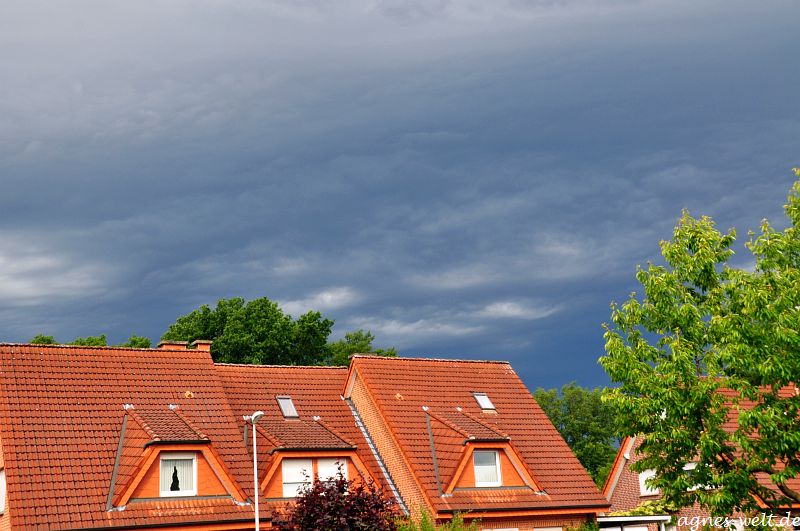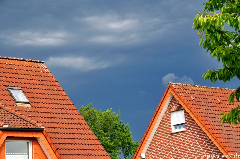 Jetzt sieht es so aus, als braue sich ein weiteres Gewitter zusammen, und der Kontrast zwischen Sonne und dunklen Wolken sieht so interessant aus, das mußte ich mal schnell festhalten, auch wenn die Motive (Nachbars Dächer) nicht so fotogen sind.