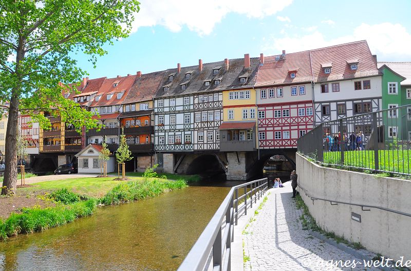 Ein bekanntes Wahrzeichen von Erfurt ist die 120 m lange Krämerbrücke, die längste durchgehend mit Häusern bebaute und bewohnte Brücke Europas. Die Fußgängerbrücke überspannt einen Seitenarm der Gera.