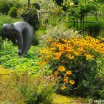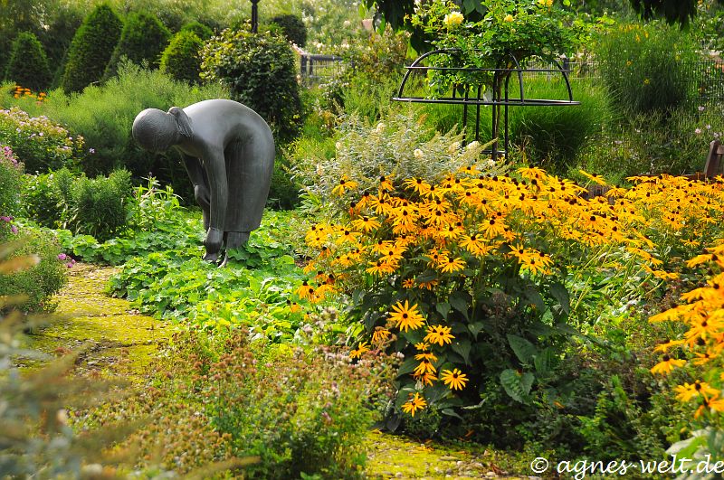 Im Kreislehrgarten stehen einige Skulpturen, die ich sehr mag. Diese Wildkrautjäterin steht laufend in einer anderen Blütenpracht, oder auch auf leerem Feld wie im Winter, und ich finde sie immer wieder anders und faszinierend.