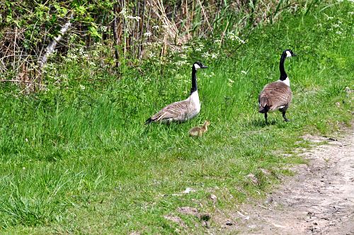 Am letzten Donnerstag hatte mein Mann gesehen, dass die Kanadagänse bei uns im Venn wieder kleine Küken haben. Er hatte 4 Familien mit je 5 bis 6 Küken gesehen, von ganz klein bis etwas größer.