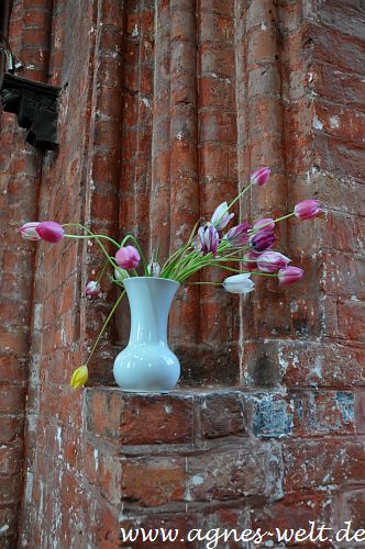 Als einen Hingucker empfand ich in der Kirche, den Tulpenstrauß vor dem roten Backsteingemäuer.