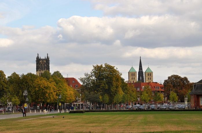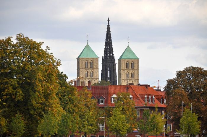 Wenn man in Münster vor dem Schloß steht, und auf die Innenstadt schaut, dann sieht man diese 3 Kirchen, bzw. ihre Türme, und wenn man ein wenig zur Seite geht, dann hat man den Turm von St. Lamberti mitten zwischen den Domtürmen, sieht doch lustig aus, oder?