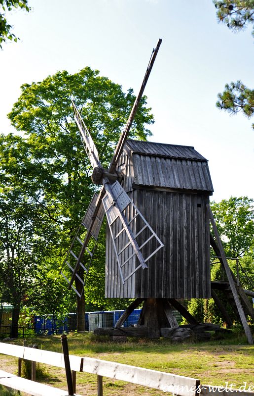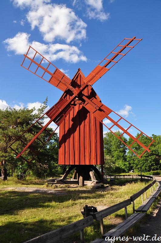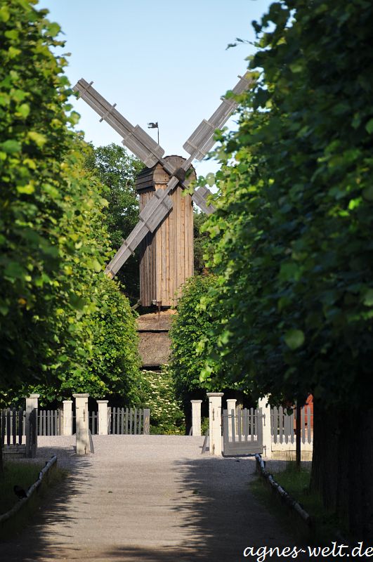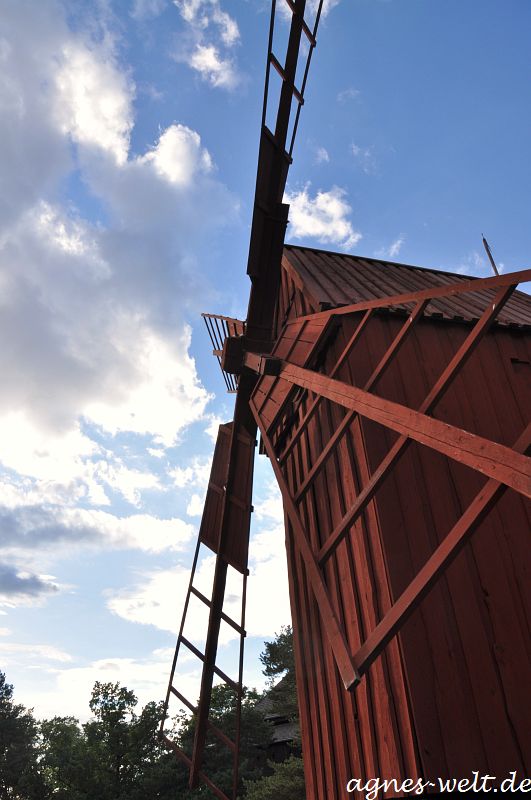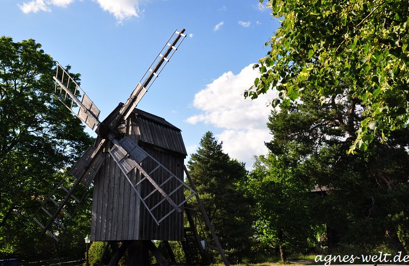 In Skansen gibt es viele historische Holzbauten, die von überall in Schweden dorthin gebracht wurden, unter anderen auch diese Windmühlen. |