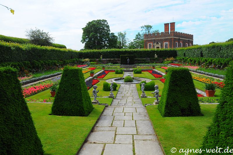 Der halbkreisförmigen Brunnengarten (Fountain Garden) mit zwölf Springbrunnen, Buchsbaumrabatten und Statuen.