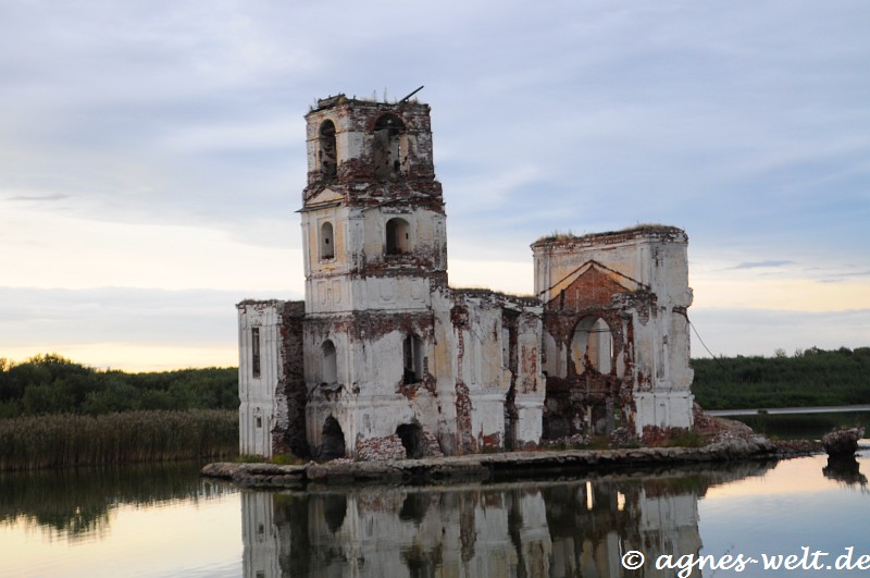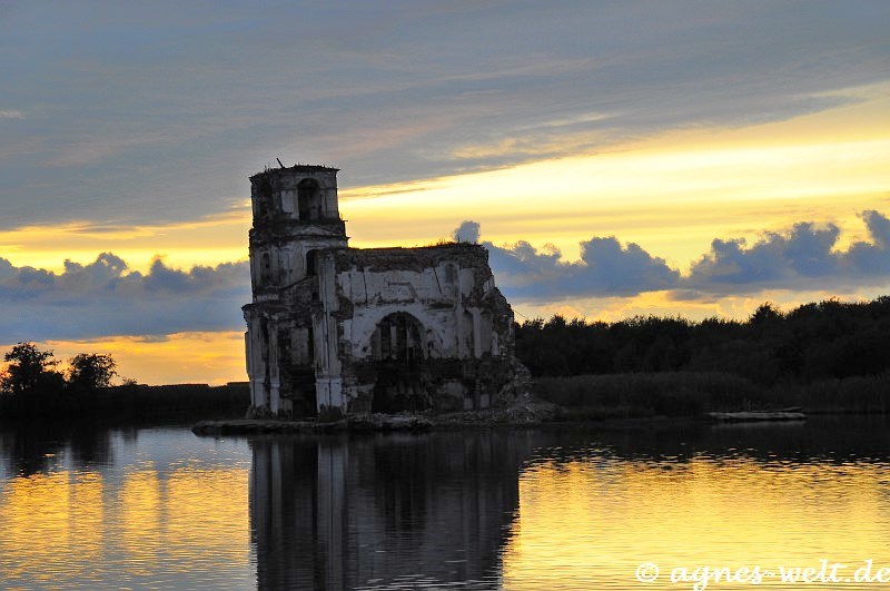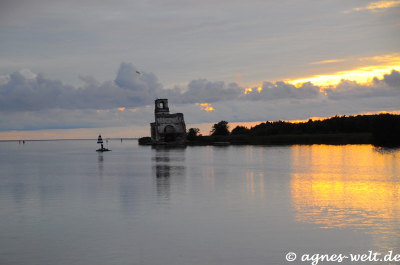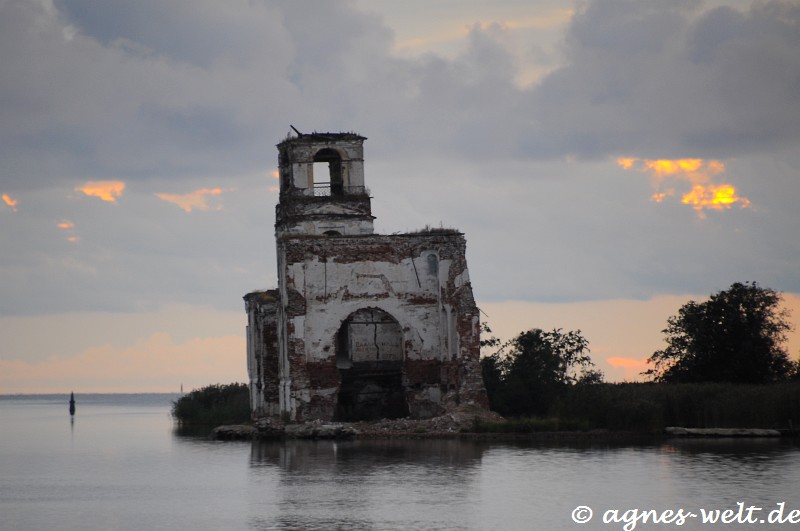 Direkt nach der Einfahrt in den Weißen See passierten wir die ehemalige Kirche, die heute einsam als Ruine aus dem Wasser ragt.
