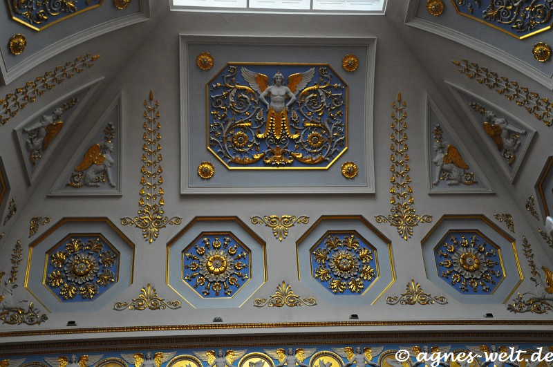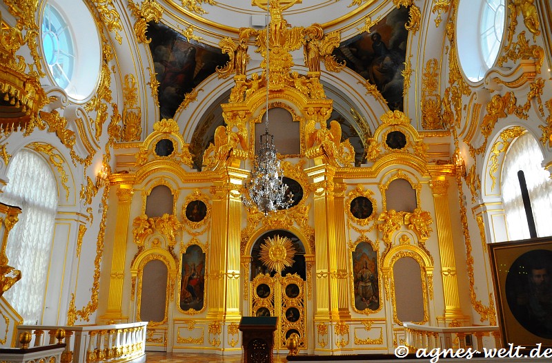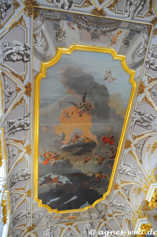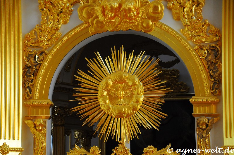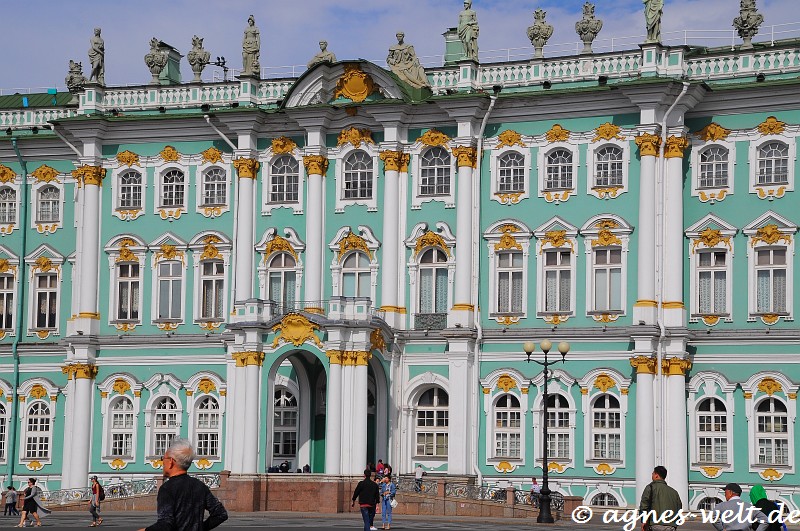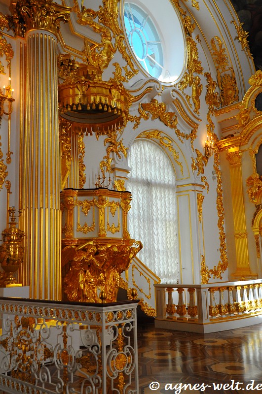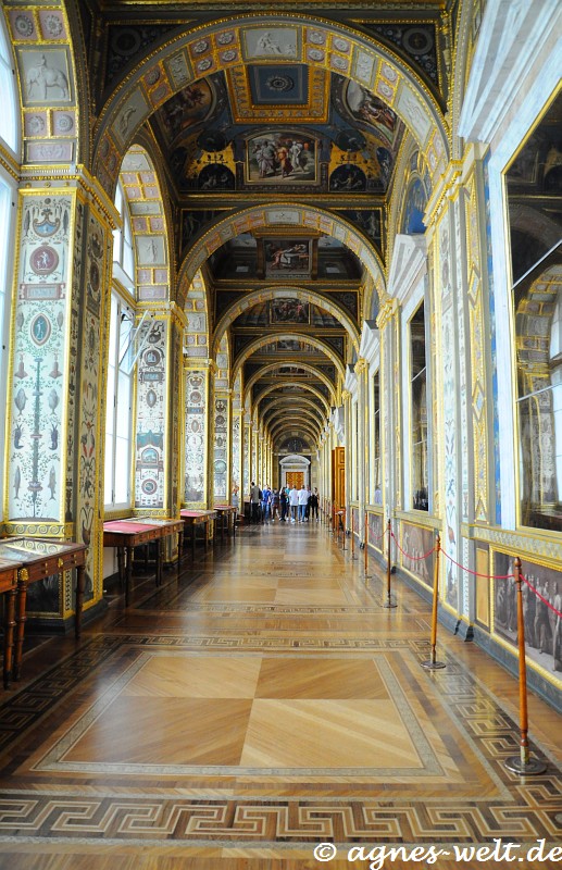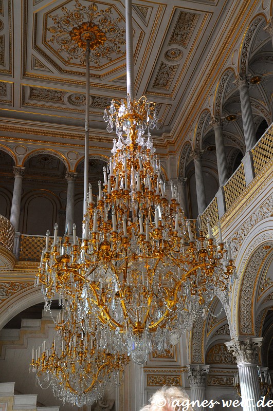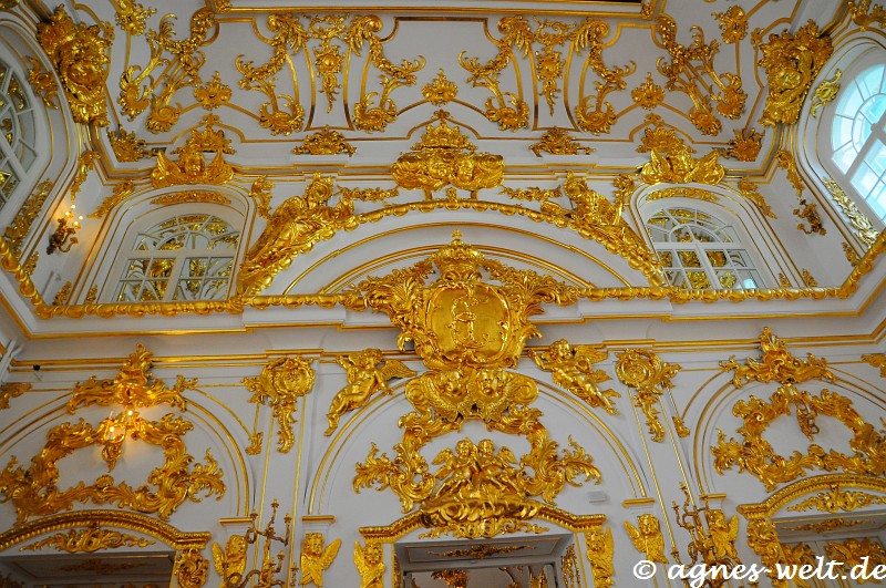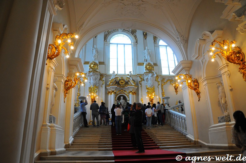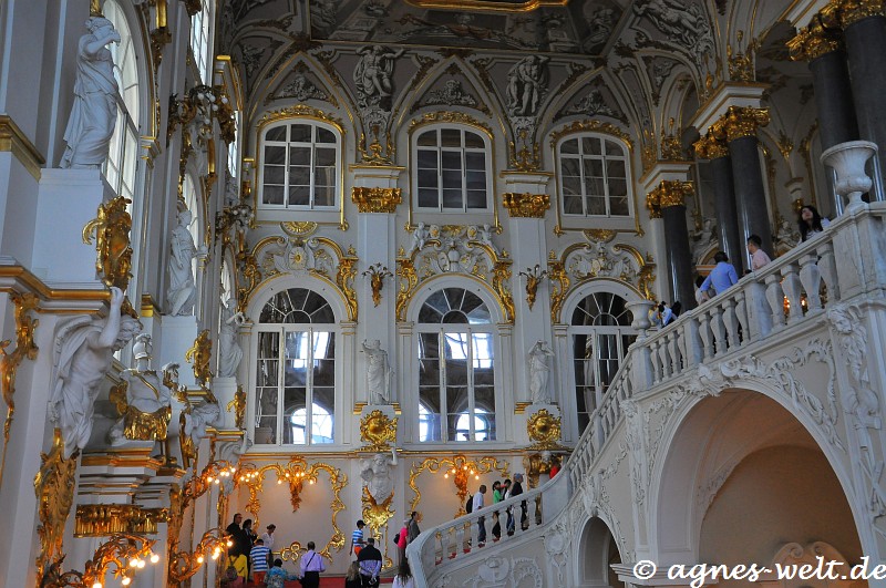 Die Jordan Treppe, die Galatreppe des Winterpalasts, die Prunkräume der Zaren mit außergewähnlichen Parkettböden sowie die mit vergoldetem Stuck verzierten Wände und Decken.