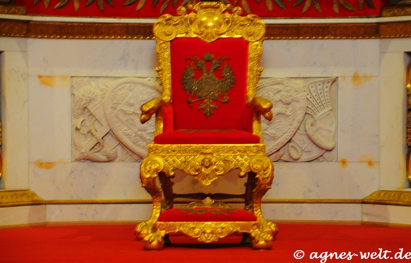 Der kleine Thronsaal ist mit weinrotem silberbesticktem Samt bespannt.