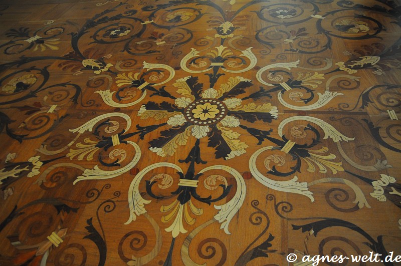 Er ist ganz in weiß und gold gehalten. Das Muster im Parkett wiederholt den Deckenschmuck.