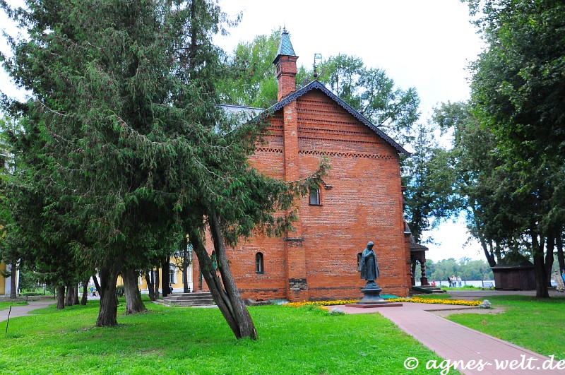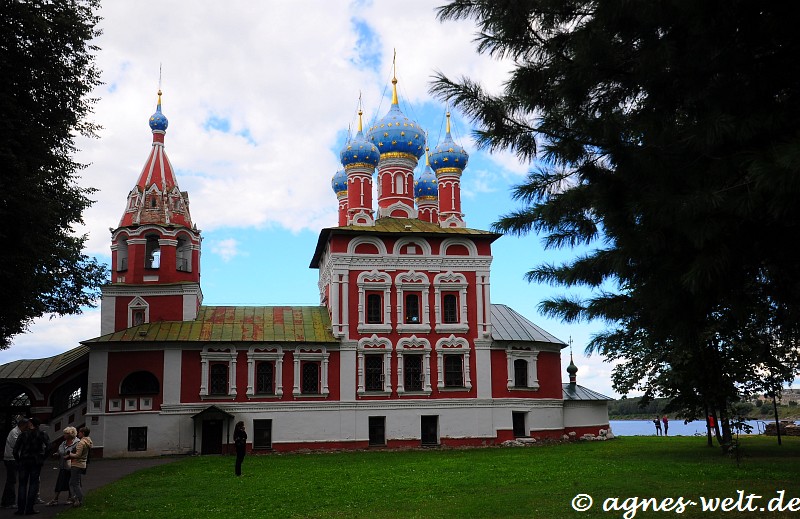 Sie wurde an der Stelle gebaut, wo Zarewitsch Dimitri verblutete. Nach einer Kapelle und einer Holzkirche wurde 1692 diese rot-weiße Steinkirche errichtet.