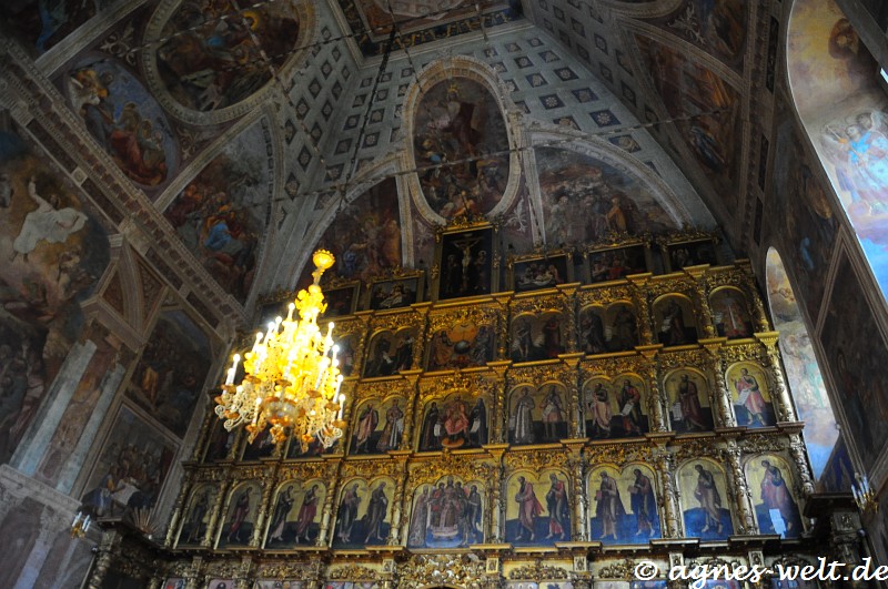 Nach einigen Erläuterungen durch Ludmilla (eine ausgezeichnete Fremdenführerin) betreten wir die farbenprächtige Dmitrijewskaja-Kirche oder Blutskirche genannt.