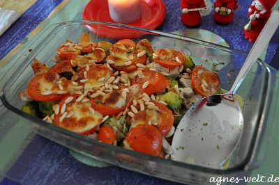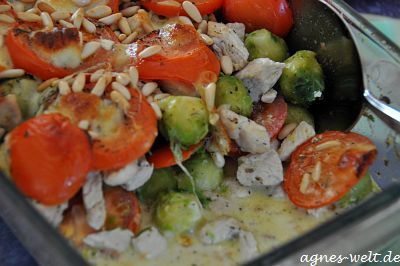 Putenfleich in Mundgerechte Stücke schneiden, in Öl braten, ebernfalls mit Pfeffer und Salz würzen. Tomaten in Scheiben schneiden. In einer Auflaufform abwechselnd Rosenkohl, Fleisch und Tomaten legen, (je nach Größe der Auflaufform) das Ganze noch einmal wiederholen. Sahne, Milch, Eigelb, Thymian, Pfeffer und Salz zu einer Sauce verrühren und über den Auflauf gießen. Mit gewürfeltem Mozzarelle belegen, und mit den Pinienkernen bestreuen. Im vorgeheizten Ofen auf der mittleren Schiene, bei 200° ca. 20 Min. überbacken Beilagen: Bratkartoffeln oder Rösties. |